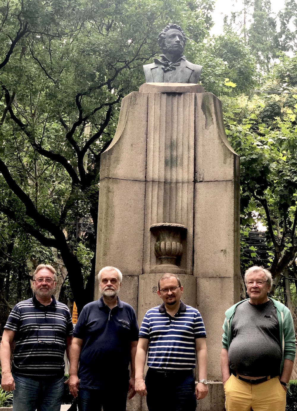 Писатели Евгений Анташкевич, Алексей Варламов, Виктор Ерофеев и председатель РКШ Михаил Дроздов у памятника А.С. Пушкину. Шанхай, июль 2019 г.