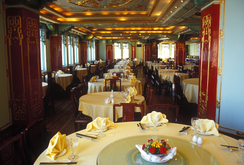 На крыше – в пирамиде – располагался огромный ресторан и терраса с завораживающими видами. Предметом гордости Cathay Hotel была «самая современная кухня в Китае» и штат поваров, состоящий из 70 китайцев, одного француза и одного британца. Посетители могли наслаждаться немецкими колбасками, и итальянским сыром и даже русской икрой.
