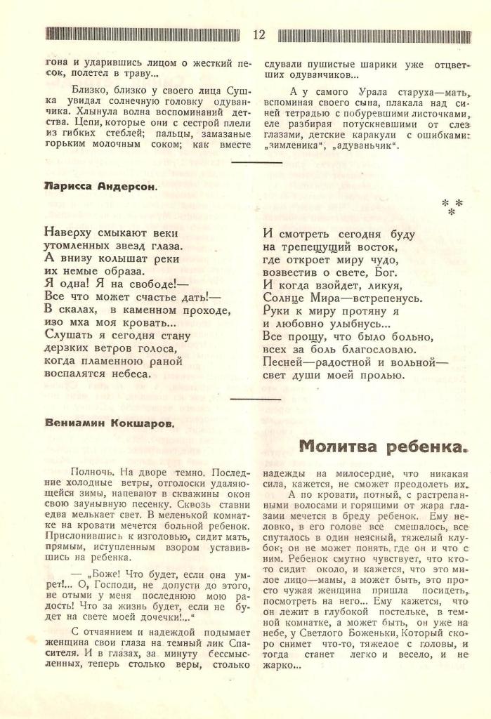 Вспоминая ушедшую от нас прекрасную поэтессу восточной ветви русской эмиграции Лариссу Андерсен, я решил познакомить читателей сайта «Русского клуба в Шанхае» со стихотворением, ставшим, судя по всему, ее первой публикацией. Стихотворение это нашлось в моем архиве в № 1 (13) журнала «Х.С.М.Л.» за январь 1928 года. Этот номер журнала, выходящего в Харбине, был целиком посвящен только что созданному объединению «Молодая Чураевка», членом которого, как известно, была и Ларисса.