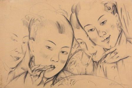 Крайне изящны по рисунку и благородству линий портреты сангиной и углем. Это изящество линий и мастерство рисунка мы видим и в многочисленных этюдах тела. Эти «ню» набросаны уверенной рукой мастера, не стесняющегося позой и ракурсом, и свидетельствуют о громадной школе, пройденной художником.